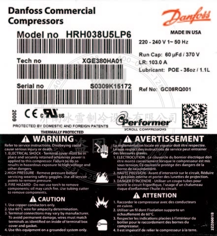 为提高丹佛斯标识 “Danfoss” 的辨识度,铭牌中不再出现丹佛斯商用压缩机 “Danfoss Commercial Compressors” 的字样。